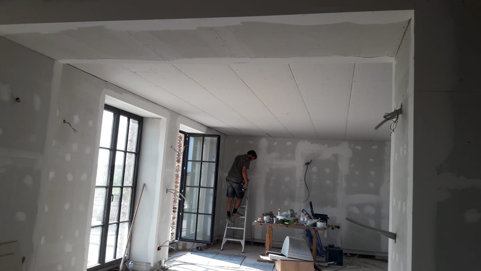 Le plancher à été poncer et vernis pour atteindre la teinte voulue par le client Cloison faite avec du fermacel et plafond en Gyproc Le musée Mudia nous remercie pour tout le travail que l’on a effectué sur place. Peinture, plafonnage, parquet,… Rénovation en cours d’un vieux parquet Le plancher à été poncer et vernis pour atteindre la teinte voulue par le client Rénovation en cours d’un vieux parquet