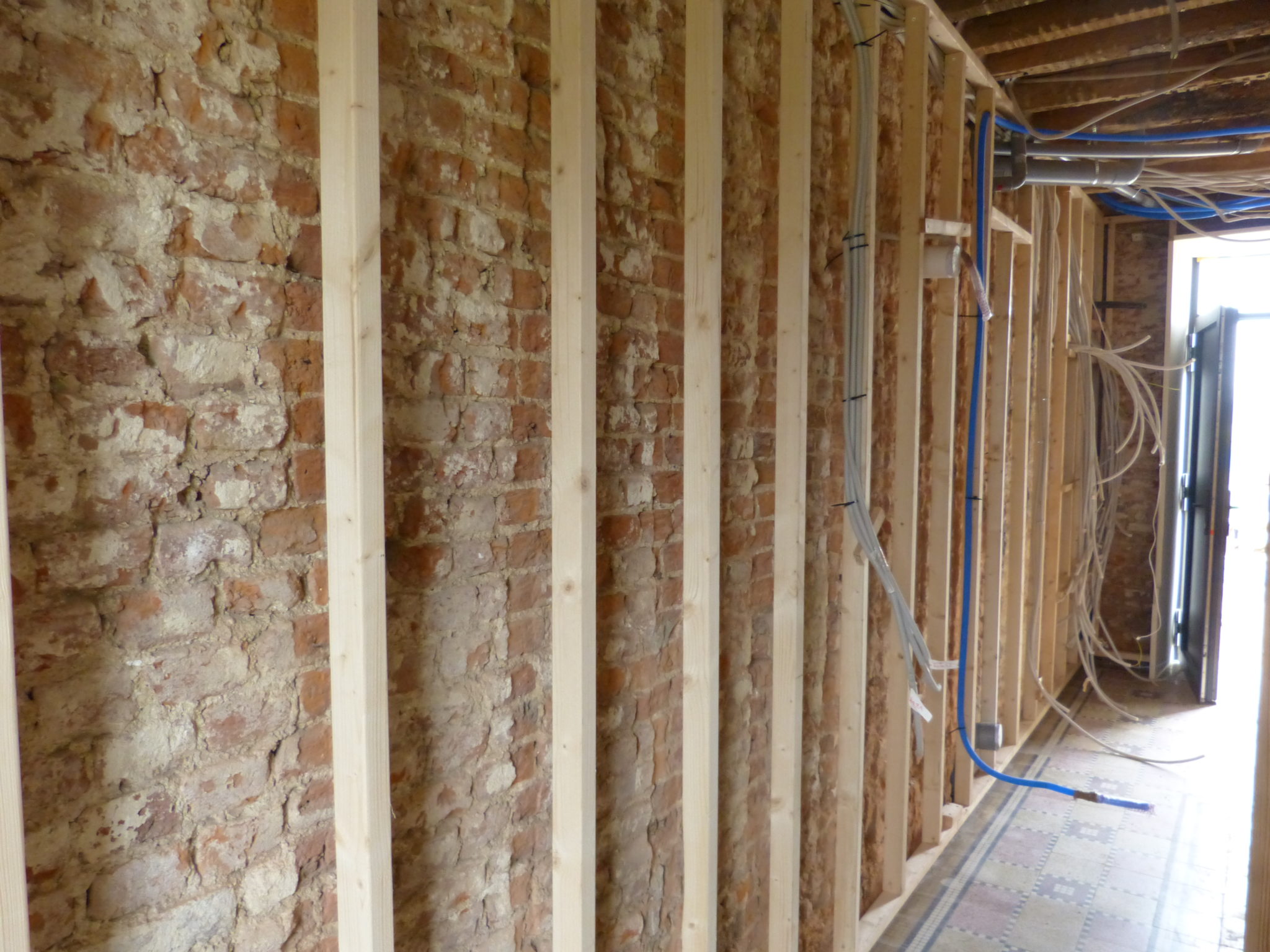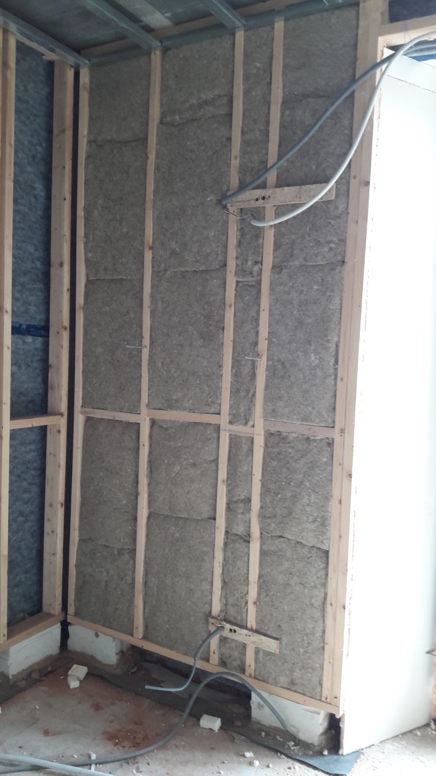 Nous réalisons des structures de cloisons en bois, ce matériau est notamment préconisé lors de la projection d’isolant car le métal se tordrait sous l’effet de la pression.